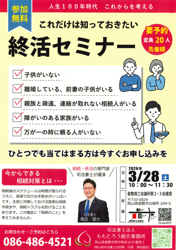 【参加無料】2026年3月28日(土)に倉敷商工会議所にて終活セミナーを開催!